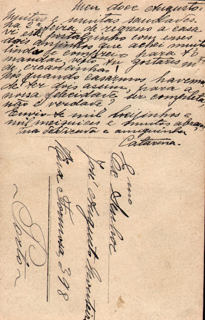 Escolhi vários postais, numa loja de coleccionismo. E a escolha foi baseada nos textos escritos, para grande espanto da vendedora. Neste postal, a "queridinha Celestina" era saudada com um até amanhã e um milhão de saudades, num discurso alusivo ao tempo cheio de subentendidos. "Pensas sempre em mim?". Assim era há muitos e muitos anos atrás. E assim continuará a ser, mesmo que já não se escrevem postais deste tipo.